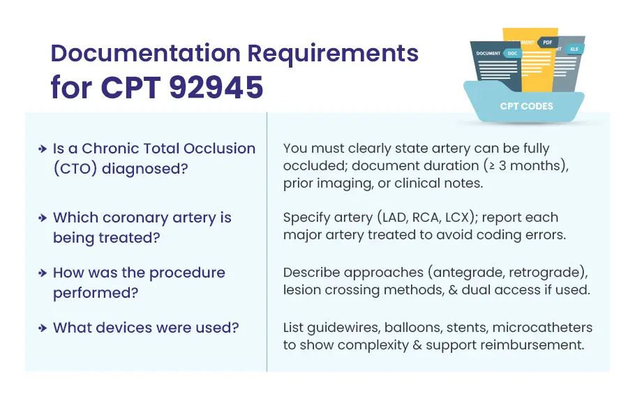 Cardiologists document CPT code 92945 when treating a chronic total occlusion (CTO) using both the antegrade and retrograde paths. This code explains the additional work involved in CTO interventions. It shows to the payers that the treatment went beyond a standard PCI.