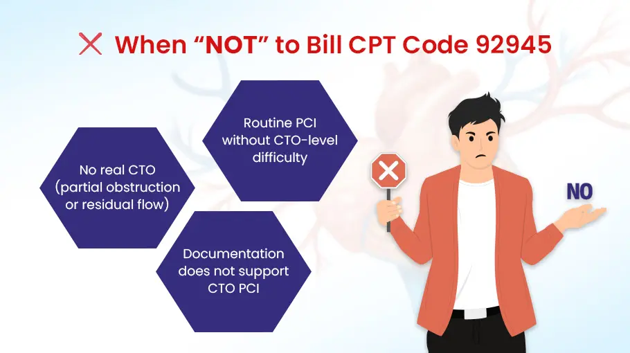 Do not use CPT 92945 if the artery is only partially narrowed. If even a tiny bit of blood is still flowing through (residual flow), it is not a Chronic Total Occlusion.